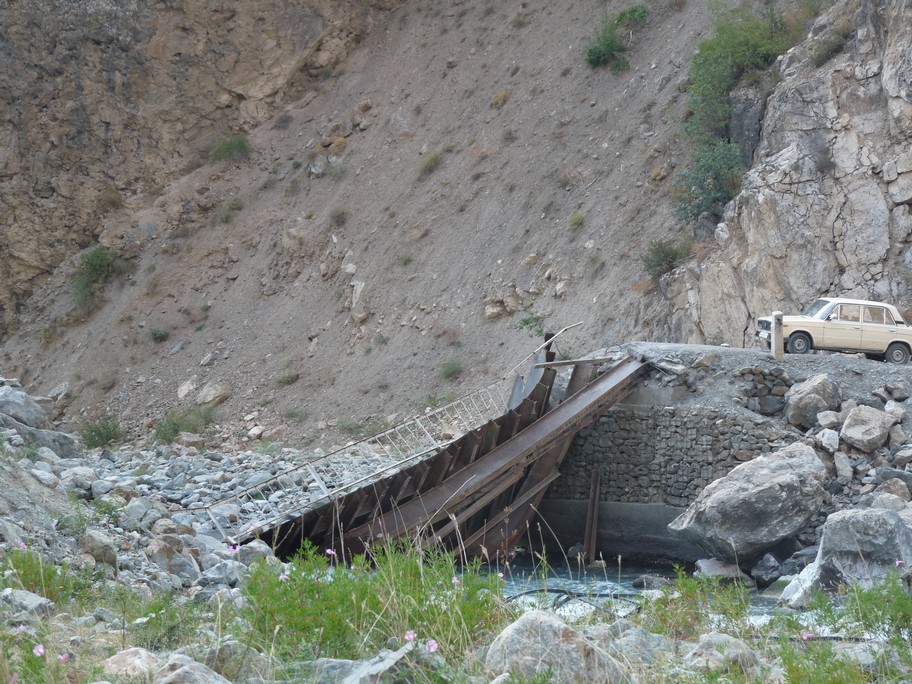 5 kilometers before Kala-Ikum, we are supposed to cross a river on this bridge. We didn’t know it had collapsed one week before.