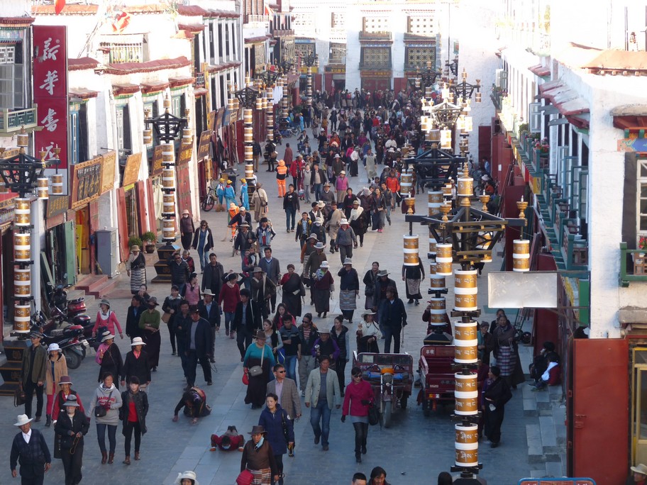 The Jokhang Temple, the most famous temple in Tibet, which attracts pilgrims from hundreds of kilometers away. They all end their pilgrimage circling the temple clockwise (very important), which generates an impressive stream of people;