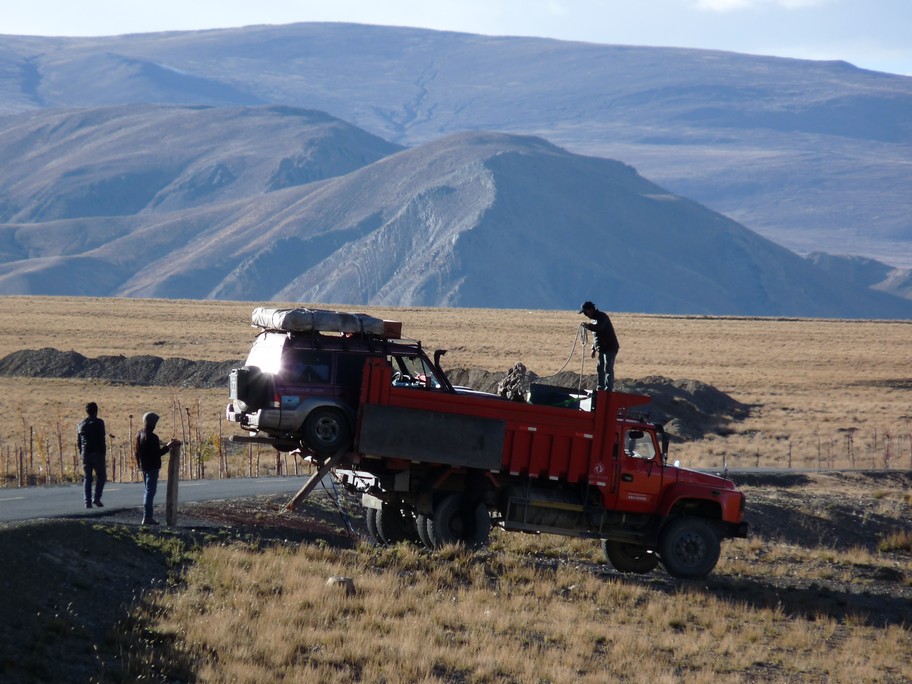 The end of our China trip is, to our great regret, also the end of galloper galloper who succumbs to a broken rear axle despite our desperate attempts to save him. Our last day in China was memorable: the Galloper had to exit China if we wanted to recover our customs deposit, but could not enter Nepal or the carnet would be stamped (and another deposit lost). We had to give up the ideas of ​​”dropping it by accident” over the bridge that connects the Tibetan side to the Nepalese side, or having it stolen or burnt or losing it. Finally, unbelievable but true, Galloper entered into Nepal pulled by Bruce (the land cruiser of Helen and Jens) while customs gently closedtheir eyes, and it ended up being bought by some Nepalese guys we met in the no man’s land between China and Nepal … What an adventure !