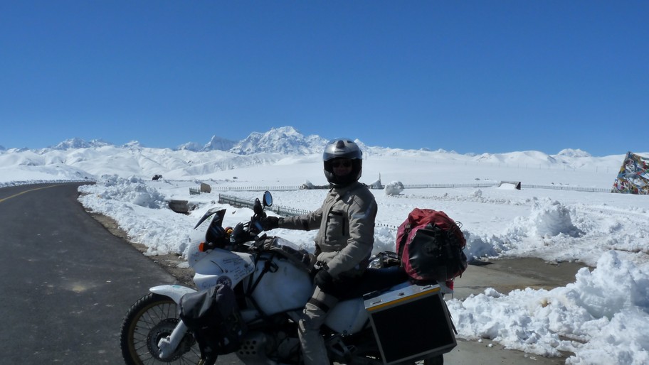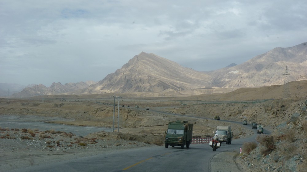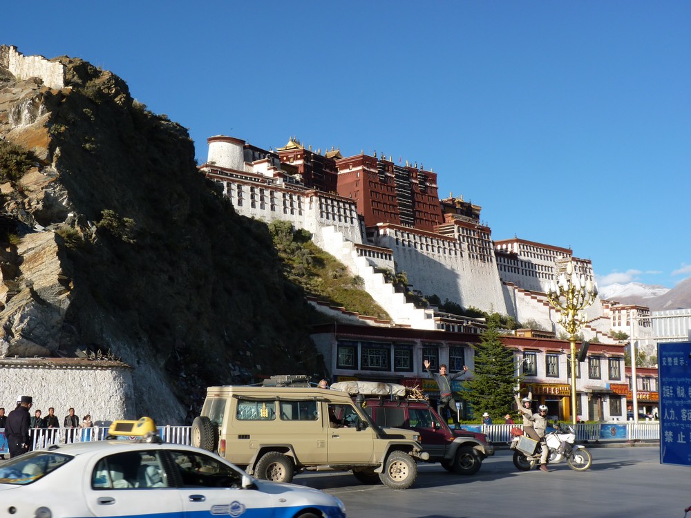 Entrer au Tibet, c’est un privilège!! Si pénétrer en Chine nous avait semblé compliqué, entrer au Tibet c’est encore une autre paire de manches. L’accès à la région est soumis à divers permis, que même les ressortissants chinois doivent obtenir. Les étrangers sont obligés d’avoir un guide (même s’ils voyagent sans leur propre véhicule). Les contrôle de police ou de l’armée sont nombreux, et la présence militaire est omniprésente: on croise plusieurs convois militaires sur la route (dont un de plus de 300 véhicules!!), les policiers sont partout à Lhasa, et il existe toutes sortes de règles – que l’on comprend plus ou moins bien – soi-disant destinées à assurer la sécurité de la région: les étrangers n’ont pas le droit de monter sur les toits des hôtels à Lhasa, on ne peut pas faire le plein de la moto à la pompe dans les stations-service (ce qui ne nous a pas facilité la vie), il est interdit de transporter de l’essence dans des bidons, faire le plein d’essence requiert au minimum 15 min de formalités administratives pour enregistrer son identité, le nombre de litres achetés, voire enregistrer ses empreintes digitales!!… Le traumatisme des moines qui se sont immolés pour réclamer l’indépendance du Tibet n’est pas loin.
