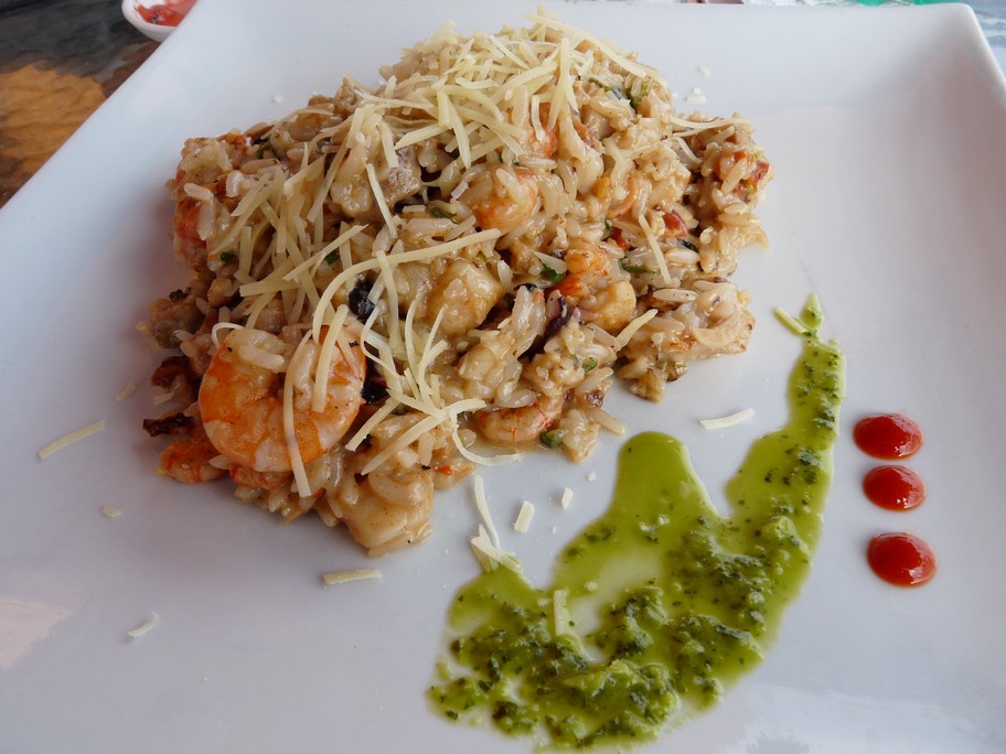 Ici la spécialité, ce sont les produits de la mer, et on en profite. En soupe grillée au parmesan en entrée, puis en risotto de fruits de mer, quel régal!