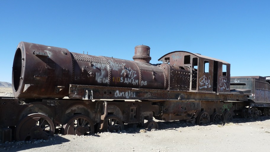 Après une bonne journée de repos à Uyuni, nous sommes prêts à repartir. La ville est agitée par des manifestations et les routes qui y mènent à l’est et au nord sont bloquées, on préfère aller voir ailleurs! Heureusement avec la moto on arrive à passer au travers des barrages, ce qui nous évite un long détour. Nous commençons la journée par une visite au cimetière des trains.fbP1160579