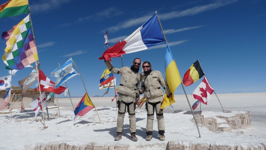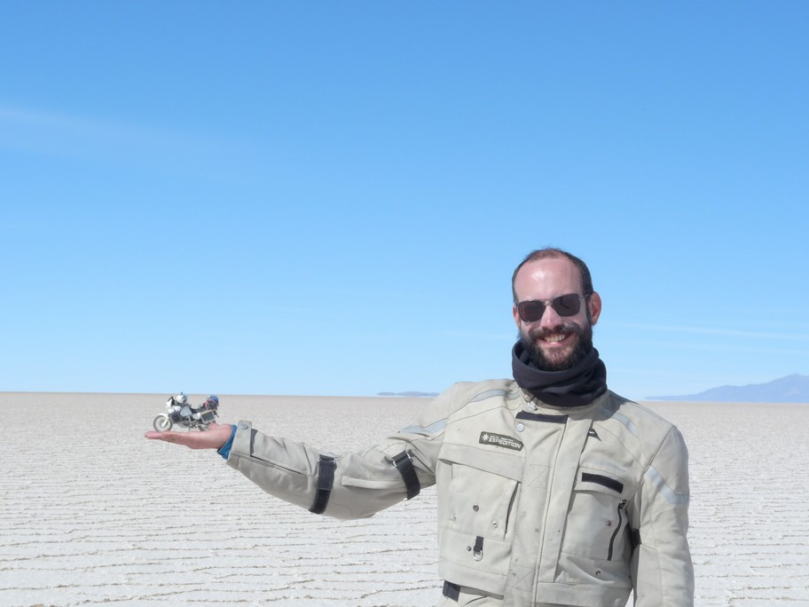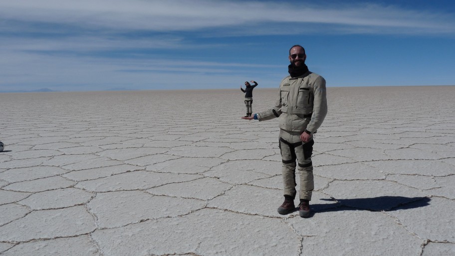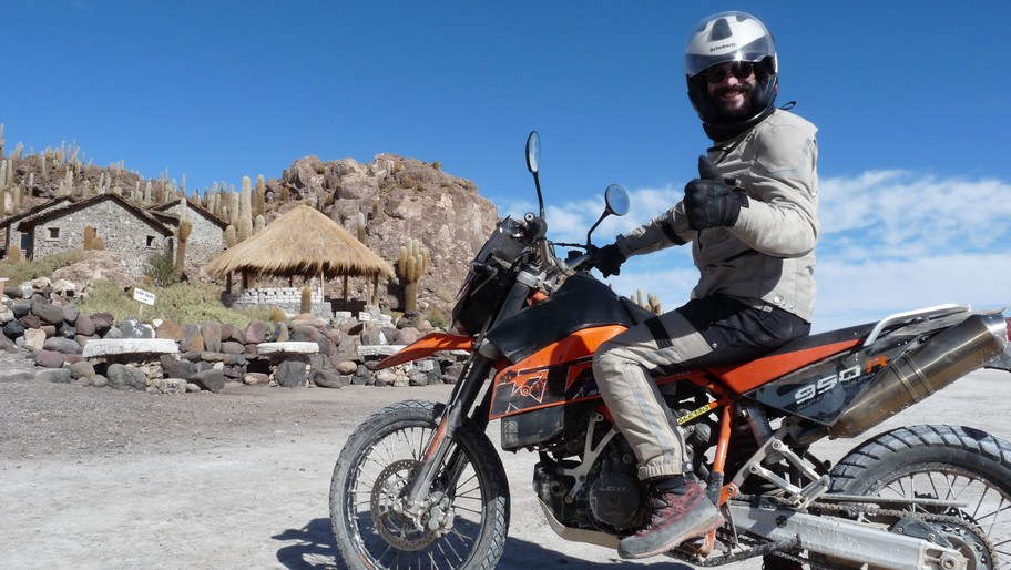On the other side of the island, there is a small restaurant where we meet Chilean bikers, and one of them offers Guillaume to ride his KTM Superenduro on the salar. He is quite happy with the experience!