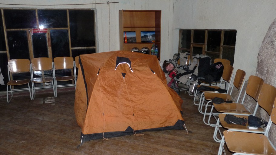 Il n’y a pas d’hôtel sur l’île mais on nous autorise à installer notre tente dans une sorte de salle de réunion où il est sensé faire un peu moins froid que dehors (on nous annonce -18°, c’est vraiment le coeur de l’hiver ici!) fbP1160723