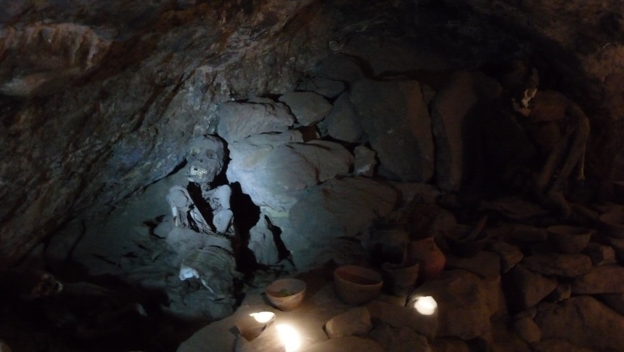 Quelques kilomètres de mauvaise piste qui grimpe fort depuis le village nous conduisent à un point de vue fabuleux. Nous laissons la moto ici et partons pour une petite marche avec le gardien. Il nous conduit à une petite porte, ouvre le cadenas, et nous voilà dans la maison des momies. Elles sont vraiment bien conservées c’est impressionnant. Et plus intimiste que le Louvre! Pas même une vitre entre elles et nous.fbP1160849 fbP1160854 fbP1160859