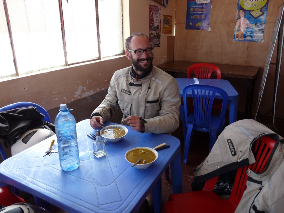 We stop on the way in a small village to eat a good “almuerzo” (lunch). We quickly become fans of the “almuzerzo completo”, a menu of the day with a soup, a main course and a drink, that costs 10 to 15 bolivianos (around 1 or 2 euros) and that you can find everywhere in Bolivia.