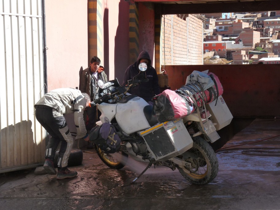 Première mission en arrivant à Potosi: laver la moto pour enlever le sel du salar. Uyuni était encore aux proies à des manifestations donc nous ne nous y sommes pas attardés. Les laveurs de voitures ont bien l’habitude et après le nettoyage ils vaporisent un produit spécial anti-corrosion.
