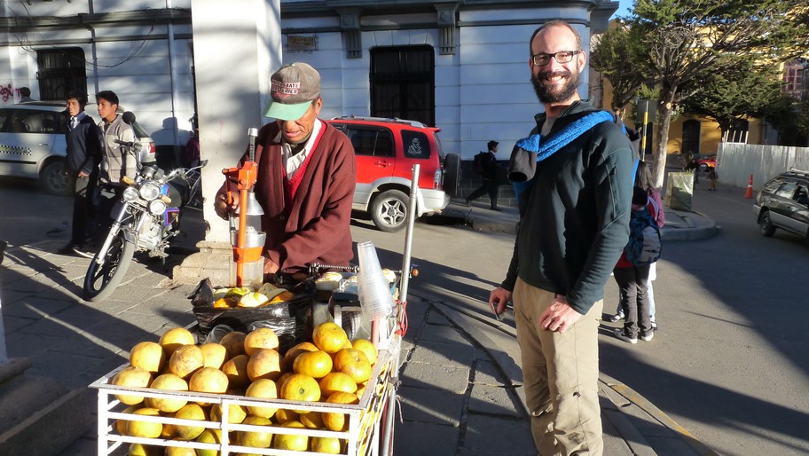 Nous prenons ensuite nos quartiers dans le centre ville. Ca n’a pas l’air comme ça, mais nous sommes à plus de 4000 mètres d’altitude, Potosi est la ville de plus de 100 000 habitants la plus haute du monde! Nous célébrons l’occasion avec un jus d’orange frais, pas d’alcool à cette altitude.