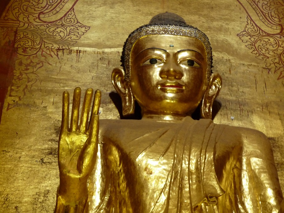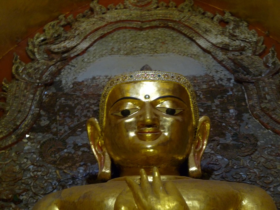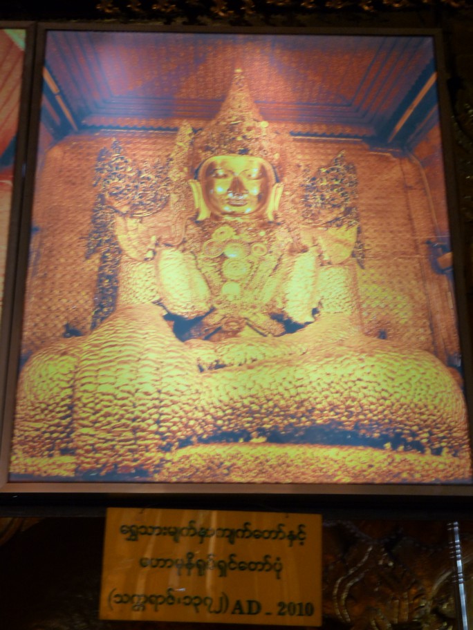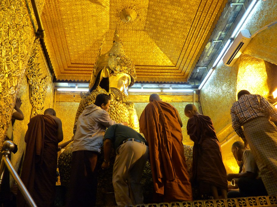 Ensuite, on va faire un petit coucou au bouddha Mahamuni. De nombreux pélerins se rendent ici pour offrir une feuille d’or au bouddha. Il attire tellement de pélerins aux feuilles d’or qu’il est devenu carrément boudiné par rapport à ce qu’il était il y a 100 ans, regardez le changement sur ses jambes et sa main!