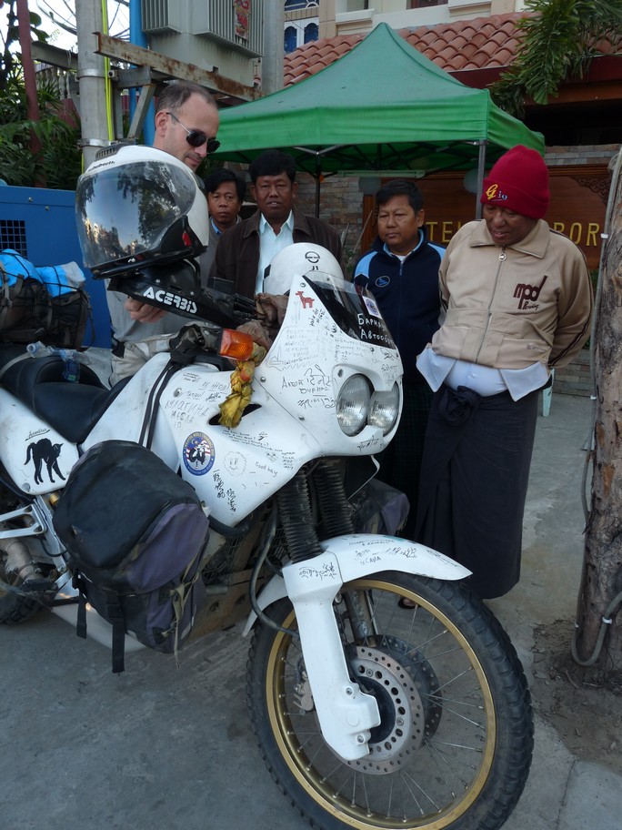 Comme d’habitude au Myanmar, nous sommes hébergés dans un super hôtel. Le personnel a même lavé la moto pour nous!
