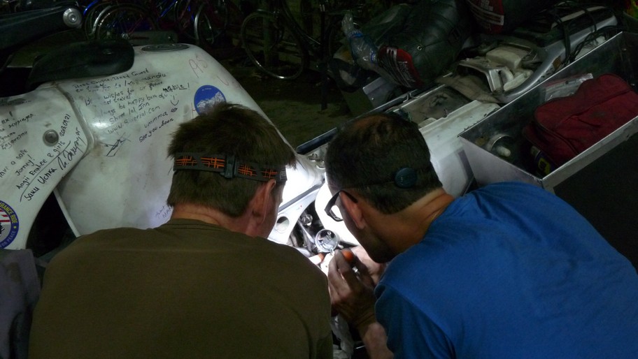 Small mechanical problem as we approach Bagan. It seems that the fuel pump is starting to show some weaknesses. Guillaume and Bruce go for a mechanical session to replace the contactors that must be worn out.