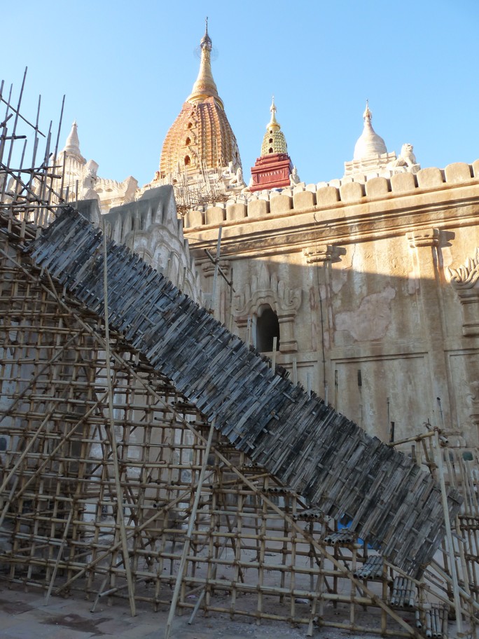Le site de Bagan a beaucoup souffert des tremblements de terre. De nombreux temples sont en restauration, les échafaudages en bambou sont impressionants!