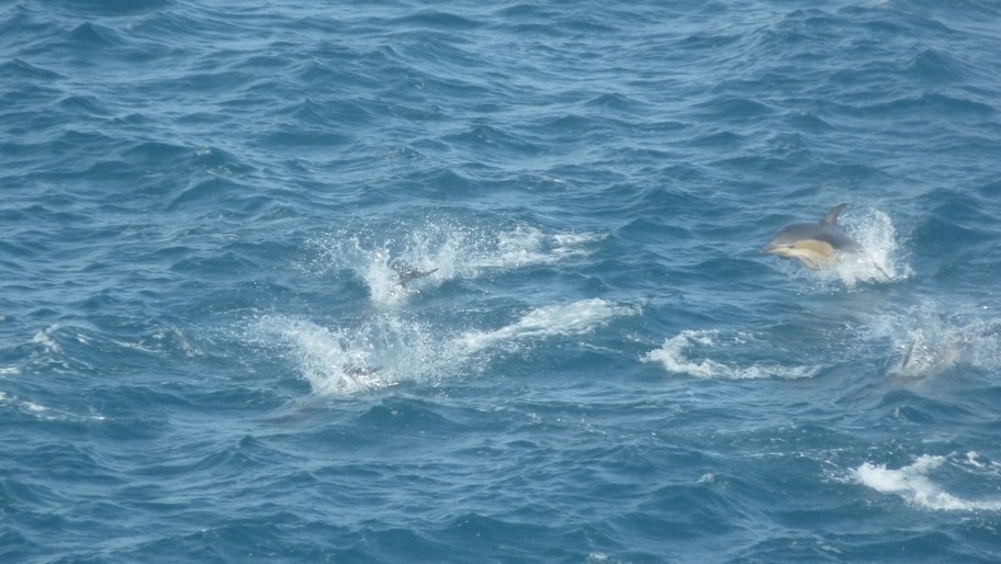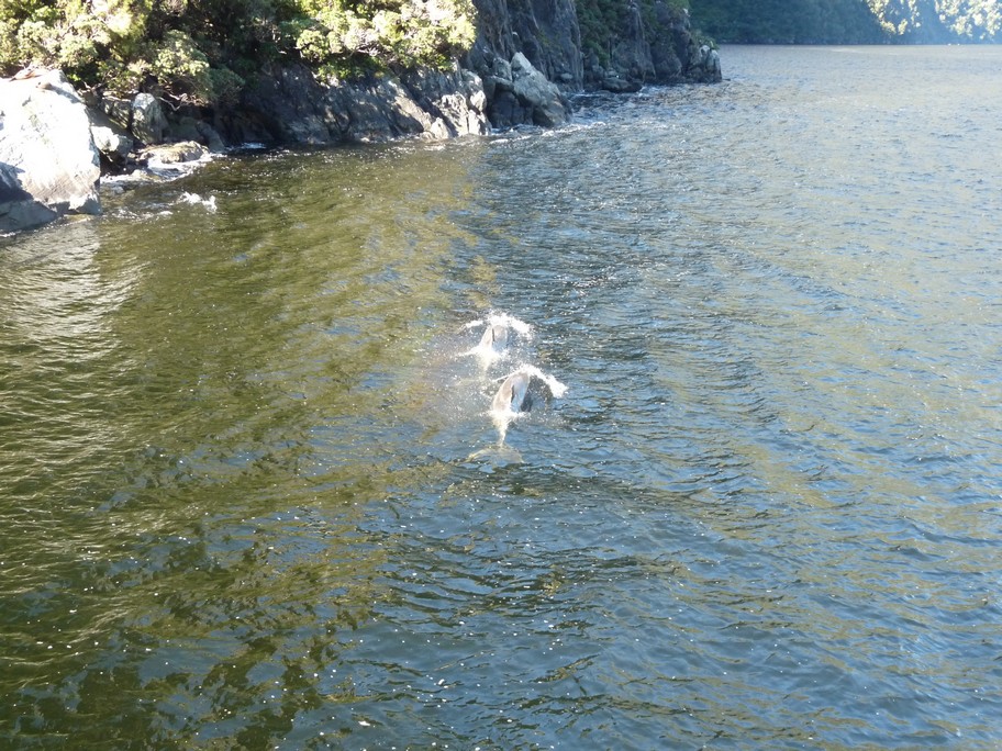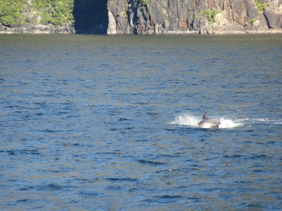Et le clou du spectacle, qui en plus n’était pas prévu: un banc de dauphins rejoint notre bateau et nous accompagne sur tout le chemin du retour de la mer vers l’intérieur du fjord. Ils sont tellement proches qu’on peut presque les toucher. C’est vraiment émouvant de voir ces créatures majestueuses si libres et si proches de nous.