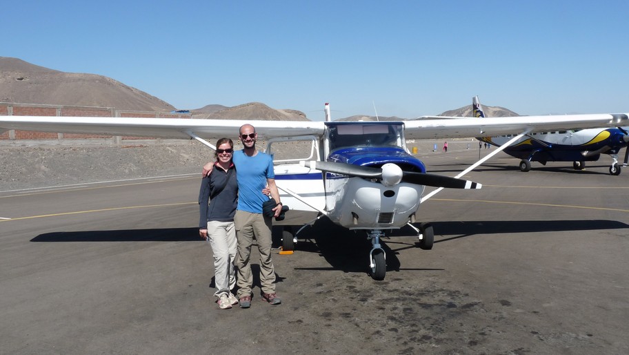 Qu’y a-t’il à Nazca? Des lignes, dessinées sur le sol il y a des siècles. Elles sont réalisées uniquement en retirant des pierres du sol et sont donc très fragiles. Le seul moyen de les observer correctement consiste à les survoler. Alors nous y allons! Nous avons ce Cessna rien que pour nous.